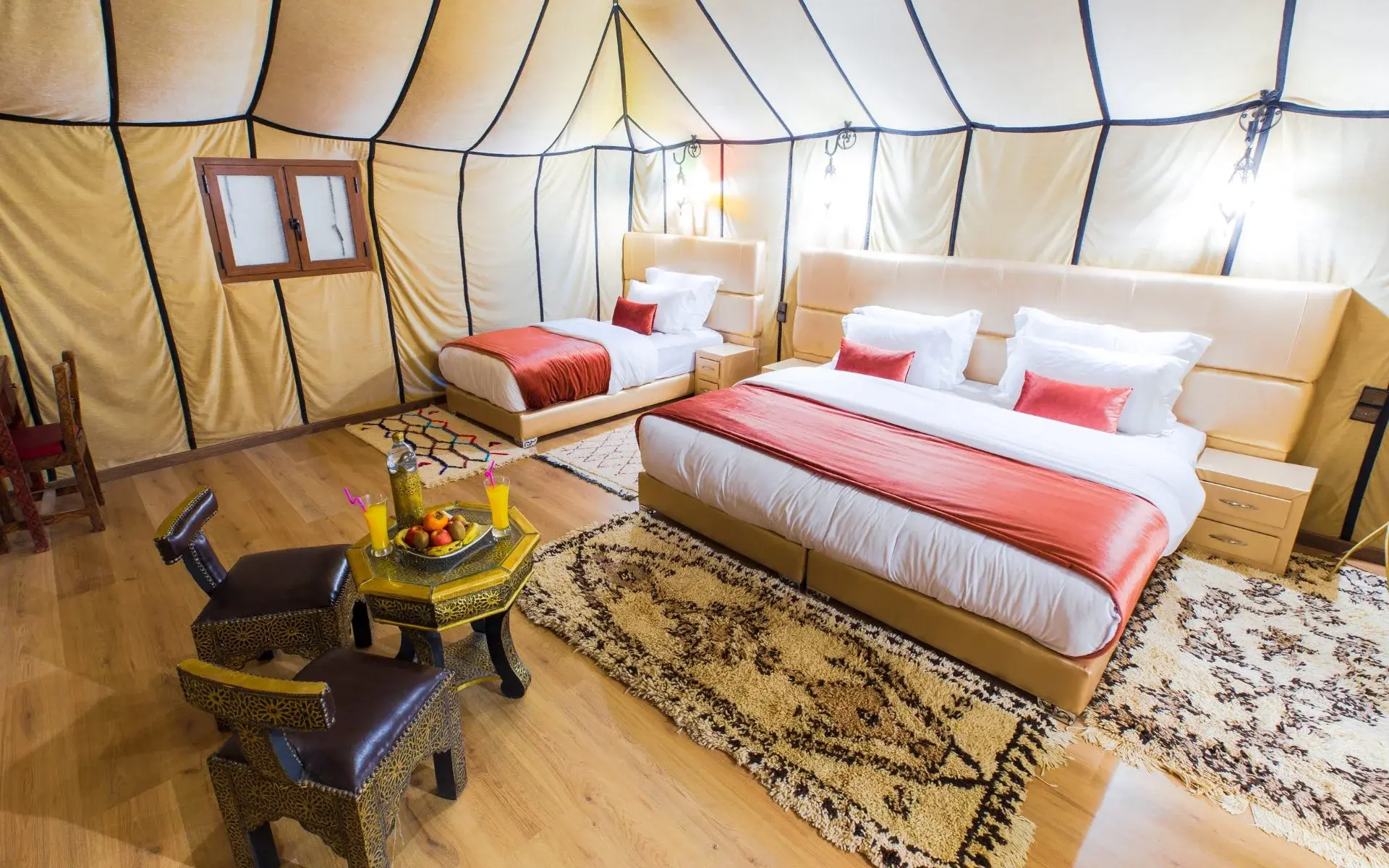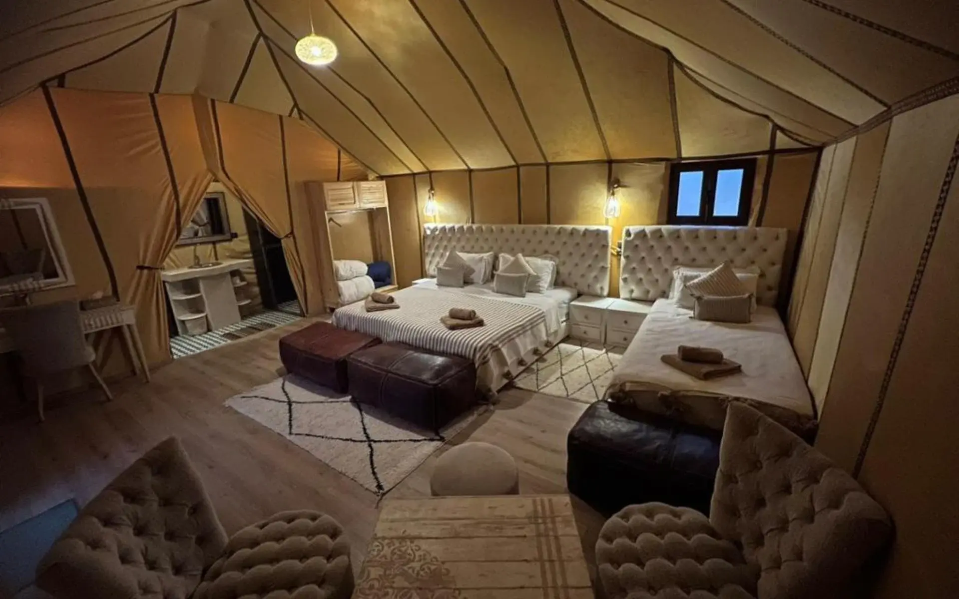 Experience an unforgettable stay at Merzouga Desert Bivouac, where comfort meets the magic of the Sahara. Sleep in luxury tents designed for single, double, triple, quadruple, or family stays, all equipped to ensure a relaxing and authentic desert experience. Enjoy traditional Moroccan hospitality, delicious meals, and the peaceful atmosphere of the desert under a sky full of stars.